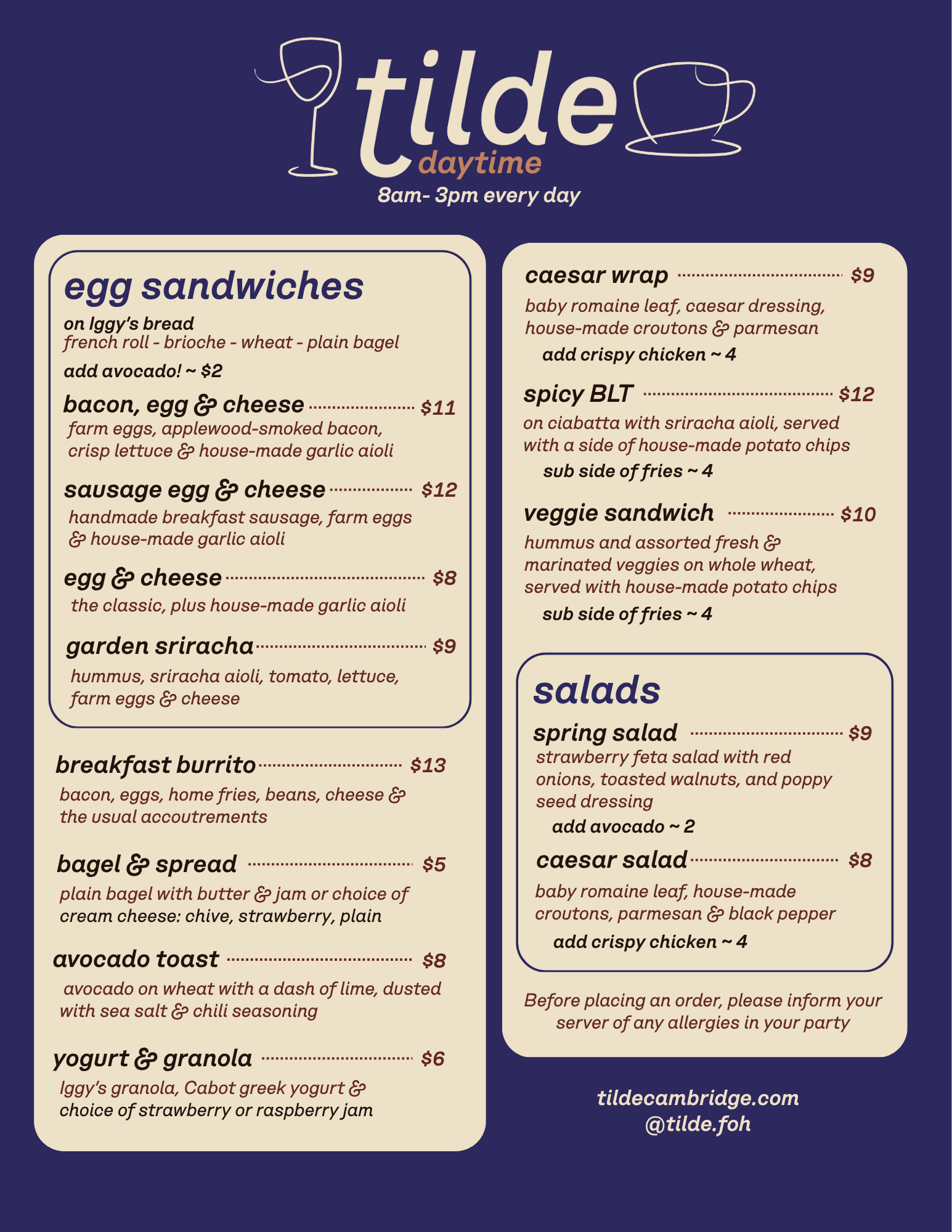 Visit us in person for the most up-to-date menus and to see our coffee specials and wine selection
